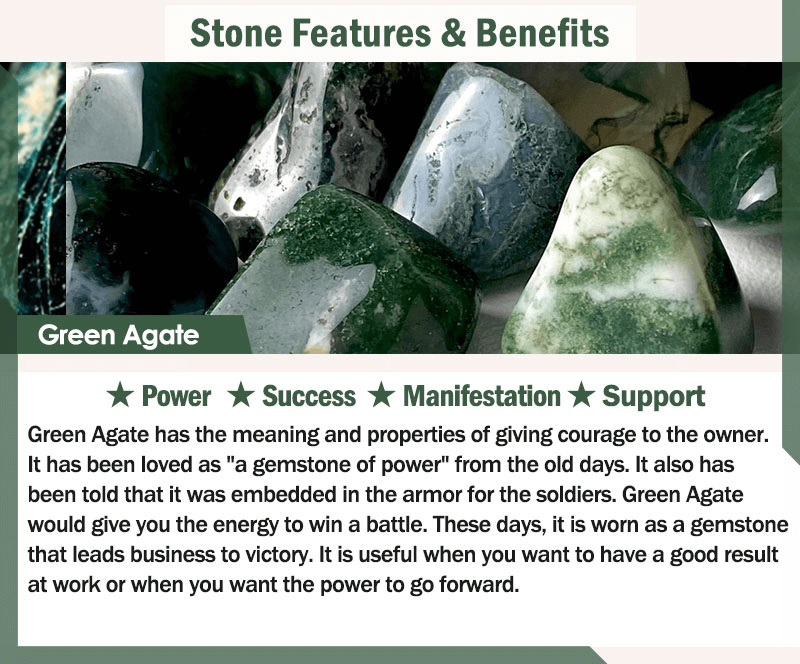 Green Agate has the meaning and properties of giving courage to the owner. It has been loved as a gemstone of power from the old days. It also has been told that it was embedded in the armor for the soldiers. Green Agate would give you the energy to win a battle. These days. it is worn as a gemstone that leads business to victory. It is useful when you want to have a good result at work or when you want the power to go forward.