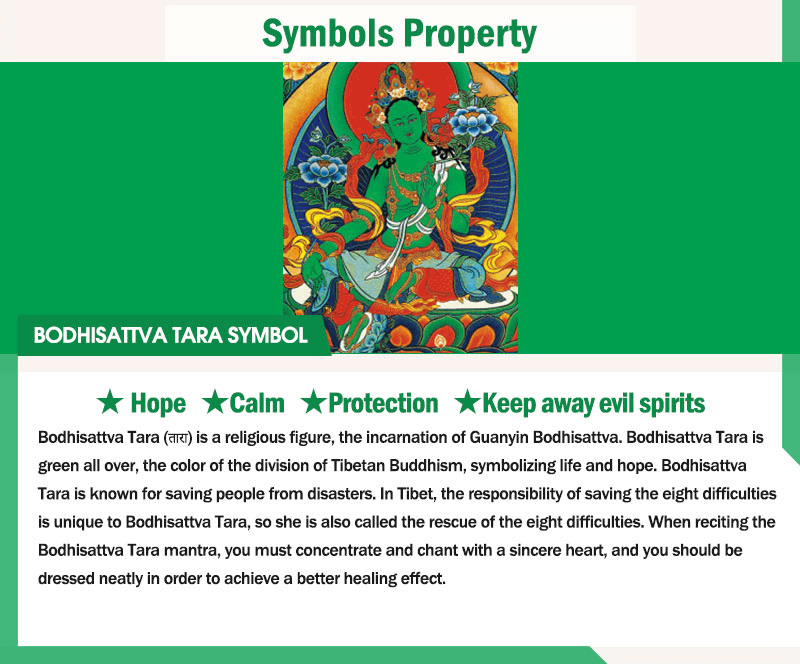 Bodhisattva Tara (तारा) is a religious figure. the incarnation of Guanyin Bodhisattva. Bodhisattva Tara is green all over. the color of the division of Tibetan Buddhism. symbolizing life and hope. Bodhisattva Tara is known for saving people from disasters. In Tibet. the responsibility of saving the eight difficulties is unique to Bodhisattva Tara. so she is also called the rescue of the eight difficulties. When reciting the Bodhisattva Tara mantra. you must concentrate and chant with a sincere heart. and you should be dressed neatly in order to achieve a better healing effect.
