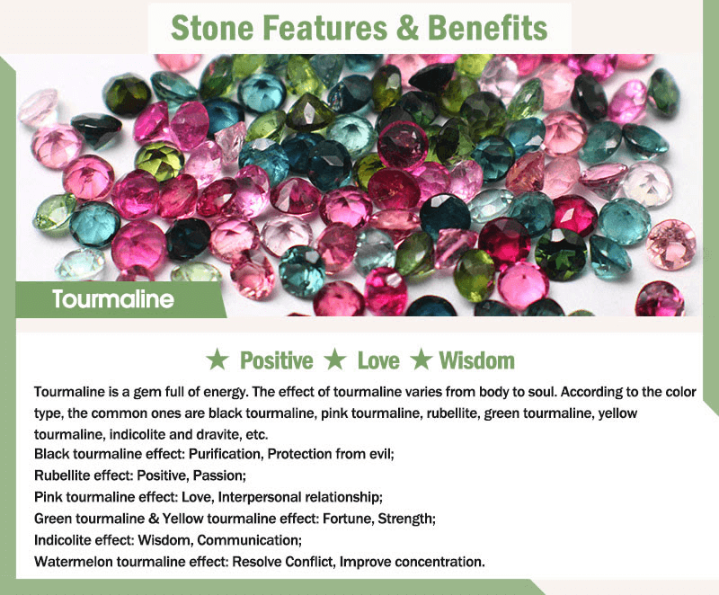 Pink tourmaline effect: Love. Interpersonal relationship; Green tourmaline & Yellow tourmaline effect: Fortune. Strength; Indicolite effect: Wisdom. Communication; Watermelon tourmaline effect: Resolve Conflict. improve concentration.LOTUS SYMBOL