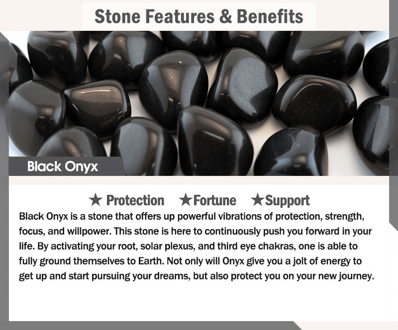 Black Onyx is a stone that offers up powerful vibrations of protection. strength. focus. and willpower. This stone is here to continuously push you forward in your life. By activating your root. solar plexus. and third eye chakras. one is able to fully ground themselves to Earth. Not only will Onyx give you a jolt of energy to get up and start pursuing your dreams. but also protect you on your new journey.