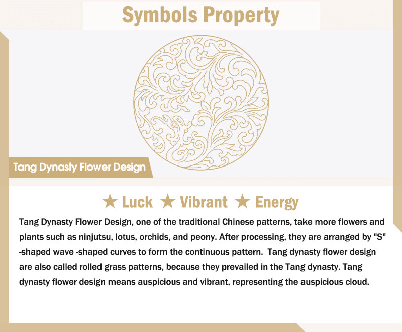 Tang Dynasty Flower Design. one of the traditional Chinese patterns. take more flowers and plants such as ninjutsu. lotus. orchids. and peony. After processing. they are arranged by S -shaped wave -shaped curves to form the continuous pattern. Tang dynasty flower design are also called rolled grass patterns. because they prevailed in the Tang dynasty. Tang dynasty flower design means auspicious and vibrant. representing the auspicious cloud.