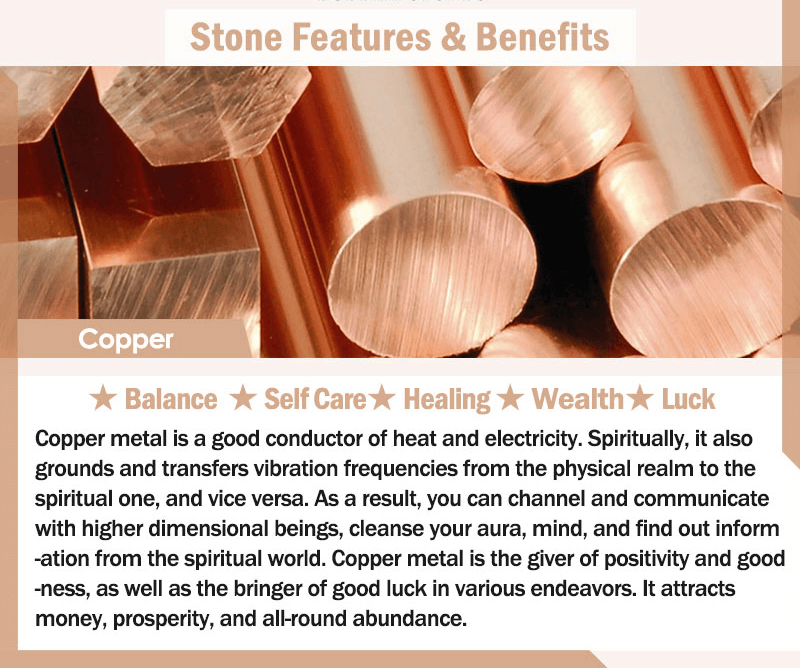 Copper metal is a good conductor of heat and electricity. Spiritually. it also grounds and transfers vibration frequencies from the physical realm to the spiritual one. and vice versa. As a result. you can channel and communicate with higher dimensional beings. cleanse your aura. mind. and find out information from the spiritual world. Copper metal is the giver of positivity and goodness. as well as the bringer of good luck in various endeavors. It attracts money. prosperity. and all-round abundance.