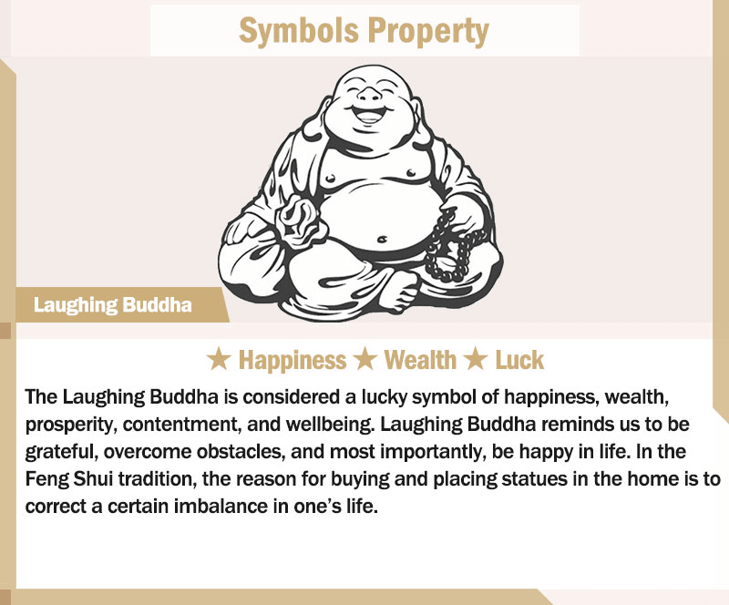 The Laughing Buddha is considered a lucky symbol of happiness. wealth. prosperity. contentment. and wellbeing. Laughing Buddha reminds us to be grateful. overcome obstacles. and most importantly. be happy in life. In the Feng Shui tradition. the reason for buying and placing statues in the home is to correct a certain imbalance in one's life.