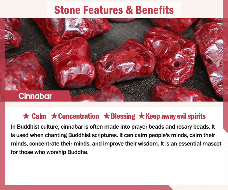 In Buddhist culture. cinnabar is often made into prayer beads and rosary beads. It is used when chanting Buddhist scriptures. It can calm people's minds. calm their minds. concentrate their minds. and improve their wisdom. It is an essential mascot for those who worship Buddha.