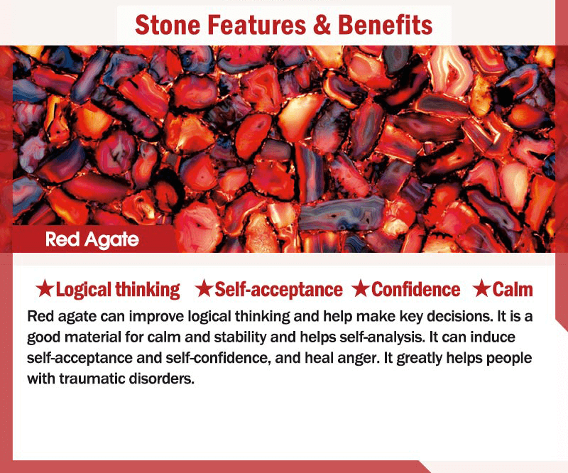 Red agate can improve logical thinking and help make key decisions. It is a good material for calm and stability and helps self-analysis. It can induce self-acceptance and self-confidence. and heal anger. It greatly helps people with traumatic disorders.