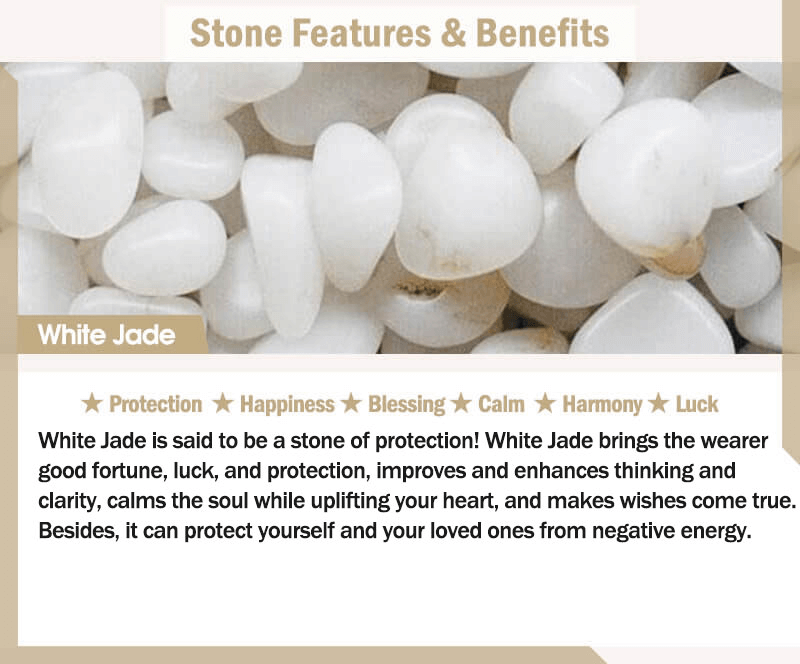 White Jade is said to be a stone of protection! White Jade brings the wearer good fortune. luck. and protection. improves and enhances thinking and clarity. calms the soul while uplifting your heart. and makes wishes come true. Besides. it can protect yourself and your loved ones from negative energy.