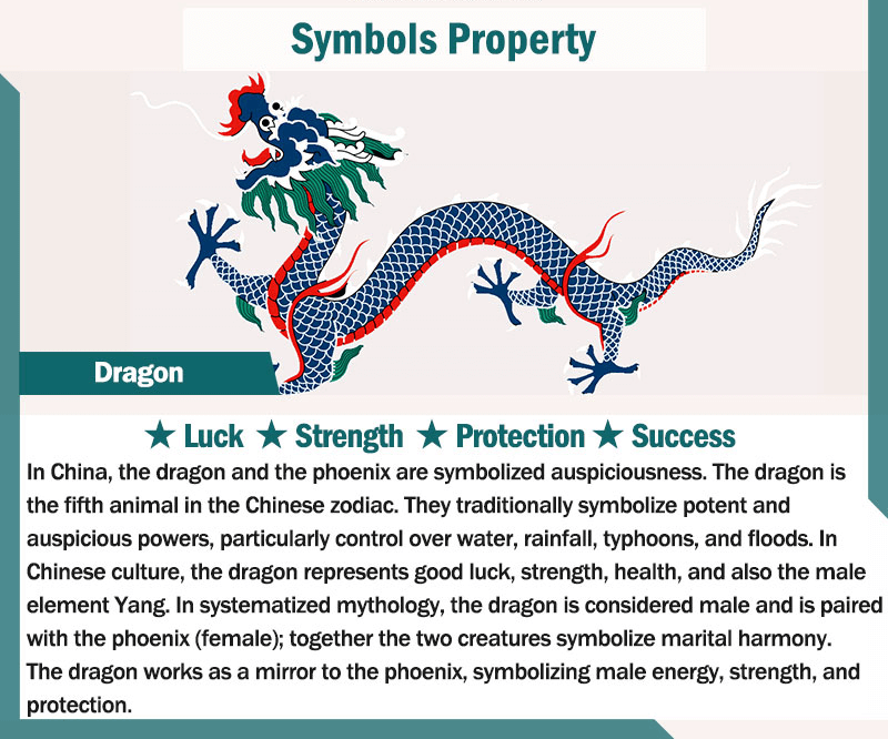 In China. the dragon and the phoenix are symbolized auspiciousness. The dragon is the fifth animal in the Chinese zodiac. They traditionally symbolize potent and auspicious powers. particularly control over water. rainfall. typhoons. and floods. In Chinese culture. the dragon represents good luck. strength. health. and also the male element Yang. In systematized mythology. the dragon is considered male and is paired with the phoenix (female); together the two creatures symbolize marital harmony. The dragon works as a mirror to the phoenix. symbolizing masculine energy. strength. and protection.