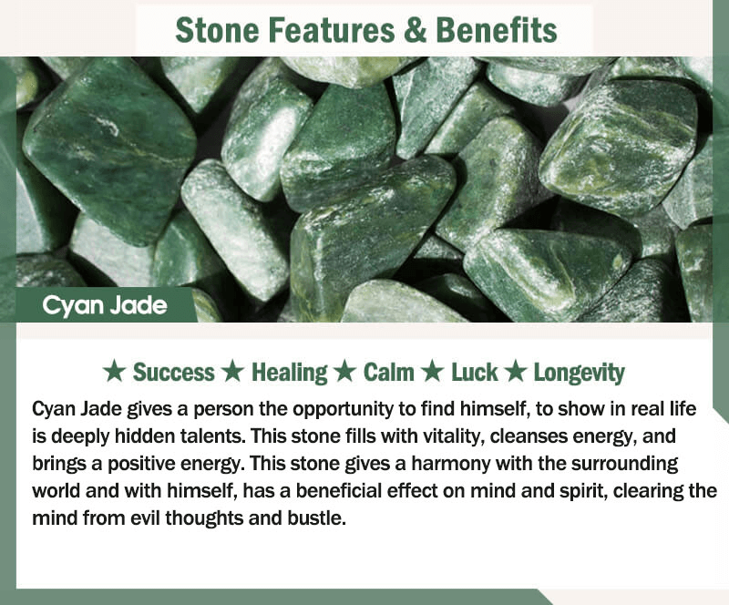 Cyan Jade gives a person the opportunity to find himself. to show in real life is deeply hidden talents. This stone fills with vitality. cleanses energy. and brings positive energy. This stone gives harmony with the surrounding world and with himself. has a beneficial effect on mind and spirit. clearing the mind from evil thoughts and bustle.